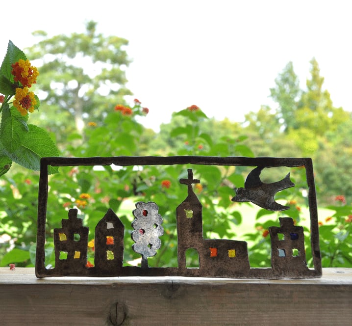 鉄板を切り抜き、ステンドグラスを貼付けてあります。
